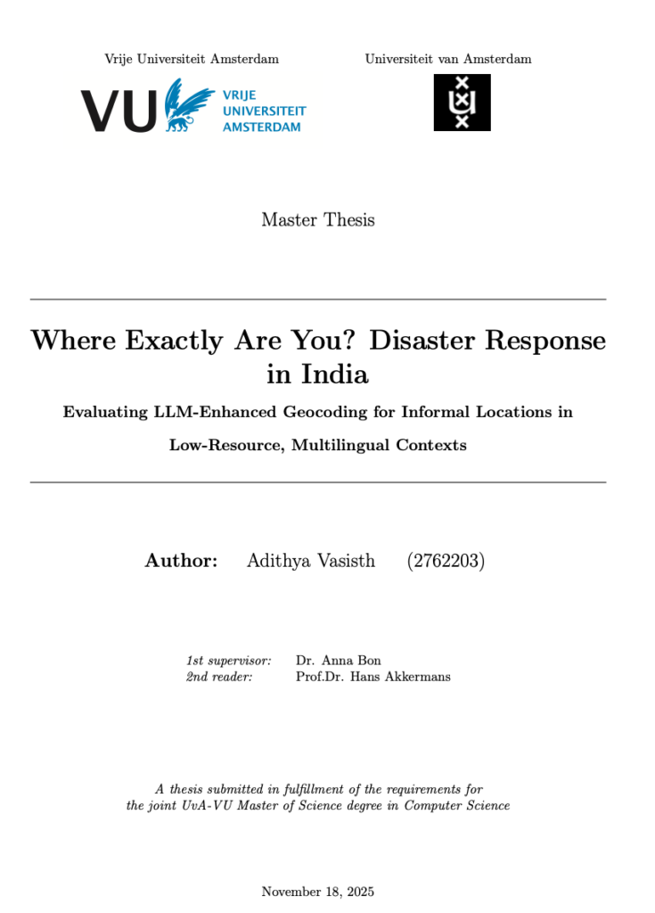 Abstract – Crisis mapping technologies assume every person has a formal address, a reliable internet connectivity, and communicates in English. Most disaster-affected communities have none of these. When disasters strike, affected populations report emergencies through platforms promising democratized response. Yet a persistent bottleneck emerges: translating informal location descriptions into coordinates that digital response systems can understand. In this thesis, master student Adithya Vasisth explores whether contemporary geocoding services and Large Language Model augmentation can address these challenges.